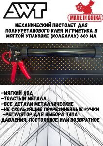 Ручной пистолет для клеев и герметиков 600 мл. тубах Ручной пистолет, создает усилие на ручке 1/18. Применяется для нанесения клеев различной вязкости. |